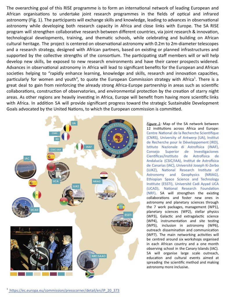 The African Initiative for Planetary and Space Science is glad to announce the submission of the project “Astronomy and Astrophysics Arising Across Africa (5A)” to the Research and Innovation Staff Exchange (RISE) Call: H2020-MSCA-RISE-2020.