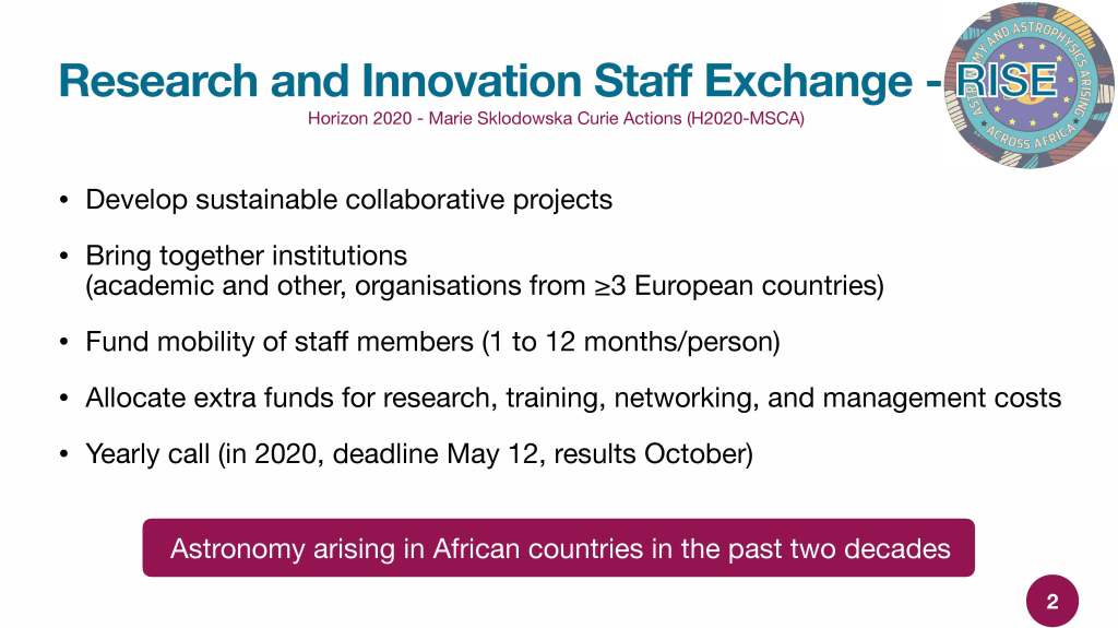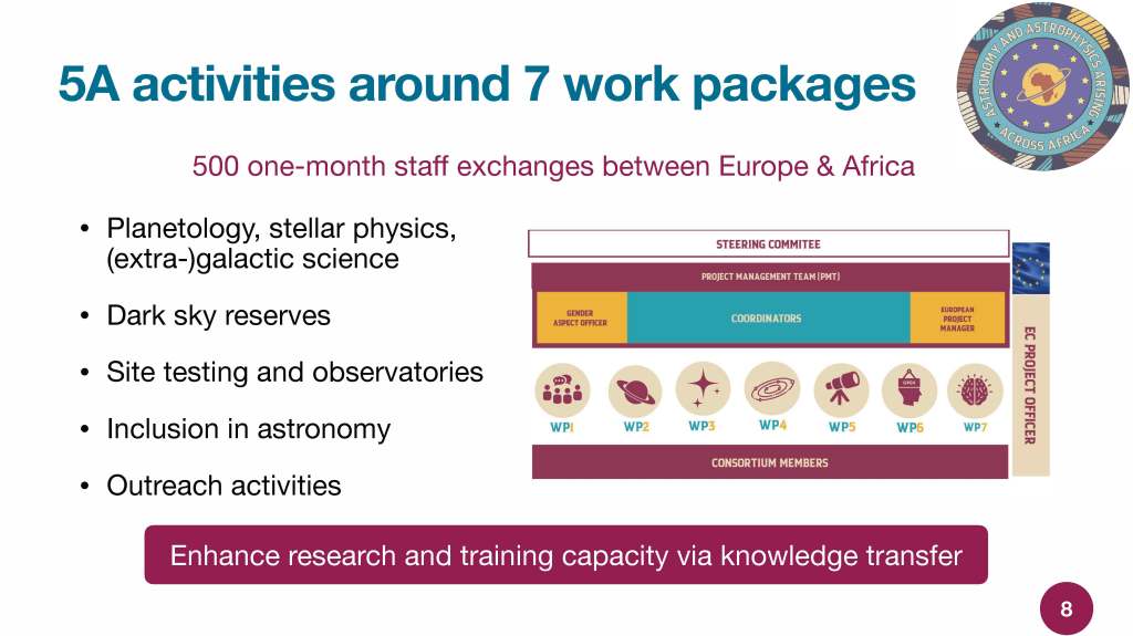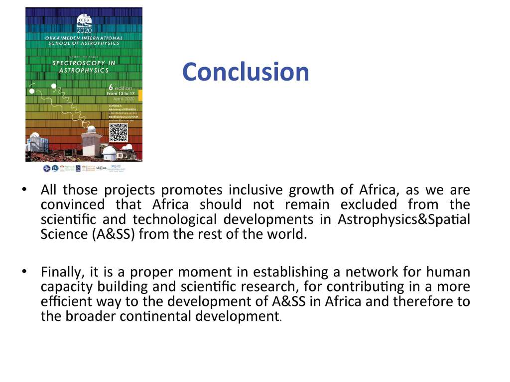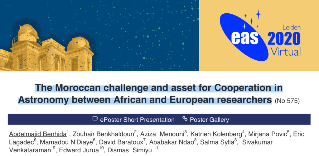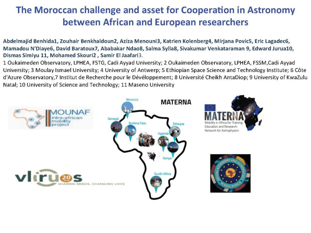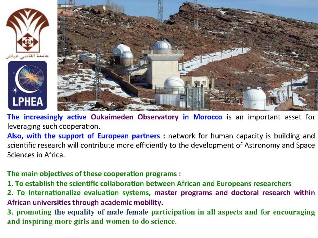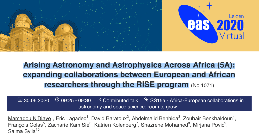 During the same session, Mamadou NDIAYE (Nice Observatory) presented the project RISE 5A (Arising Astronomy and Astrophysics Across Africa (5A): expanding collaborations between European and African researchers through the RISE program) recently submitted to the European Research Council and Adbelmadjid BENHIDA (University Cadi Ayyad) presented a contribution entitled “The Moroccan challenge and asset for Cooperation in Astronomy between African and European researchers”.
