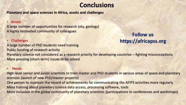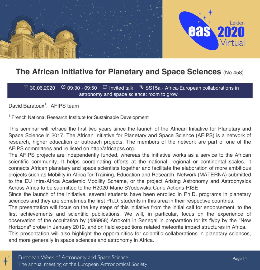 The African Initiative for Planetary and Space Sciences was presented by David Baratoux (IRD) on June 20th at the European Astronomical Society Meeting as a contribution to the session SS15a – Africa-European collaborations in astronomy and space science: room to grow.